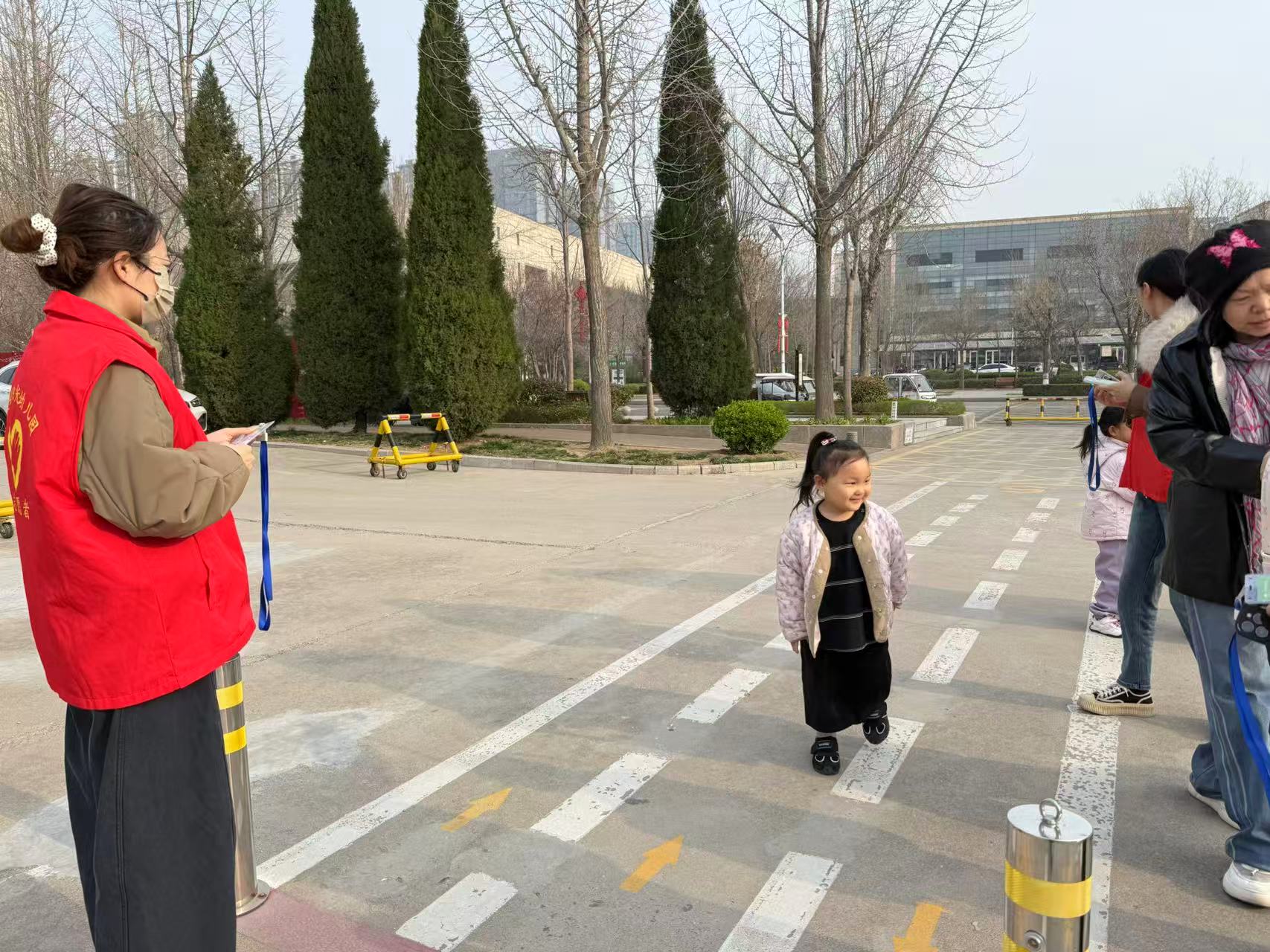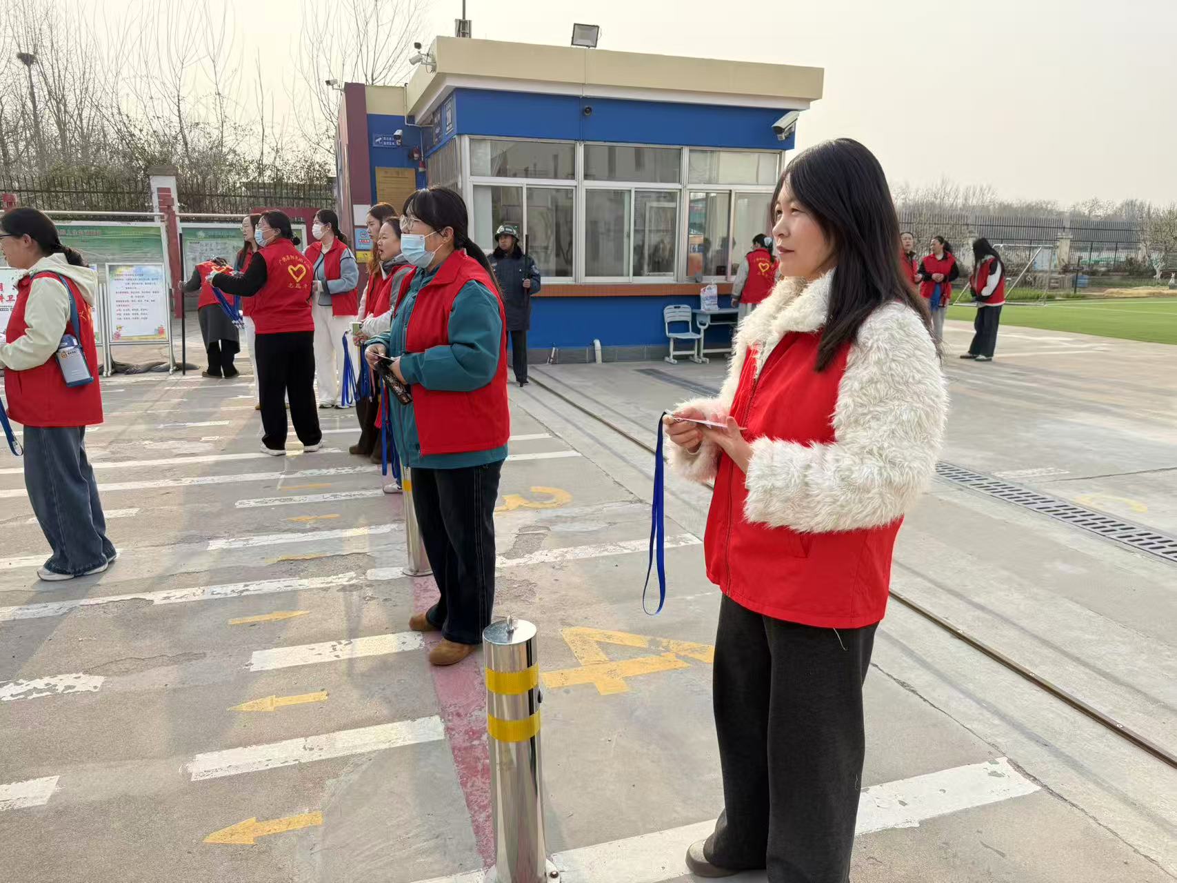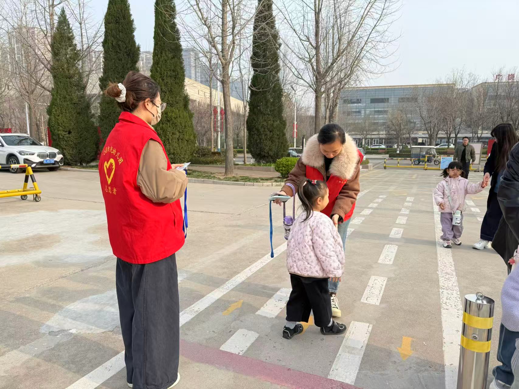 志愿者们穿好志愿服,拉好拉链,在幼儿园门口集合进行幼儿园门口的值岗服务,老师们拿好志愿旗,指挥家长们正确停放好车辆,保证幼儿安全