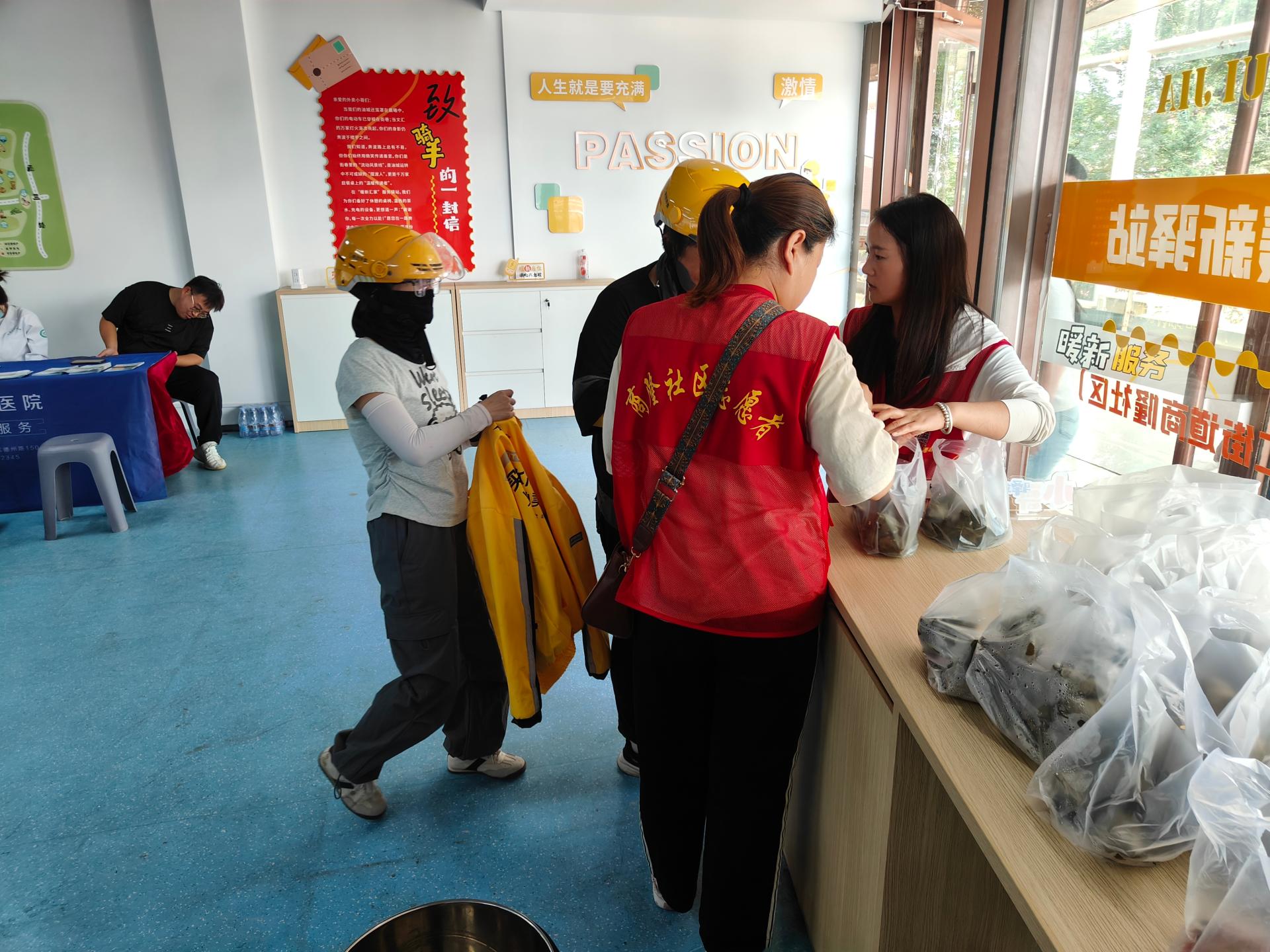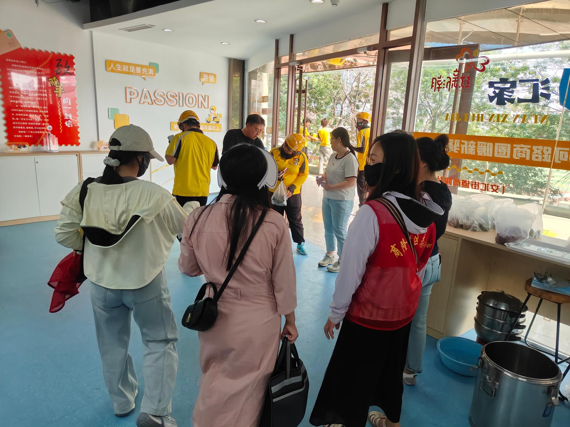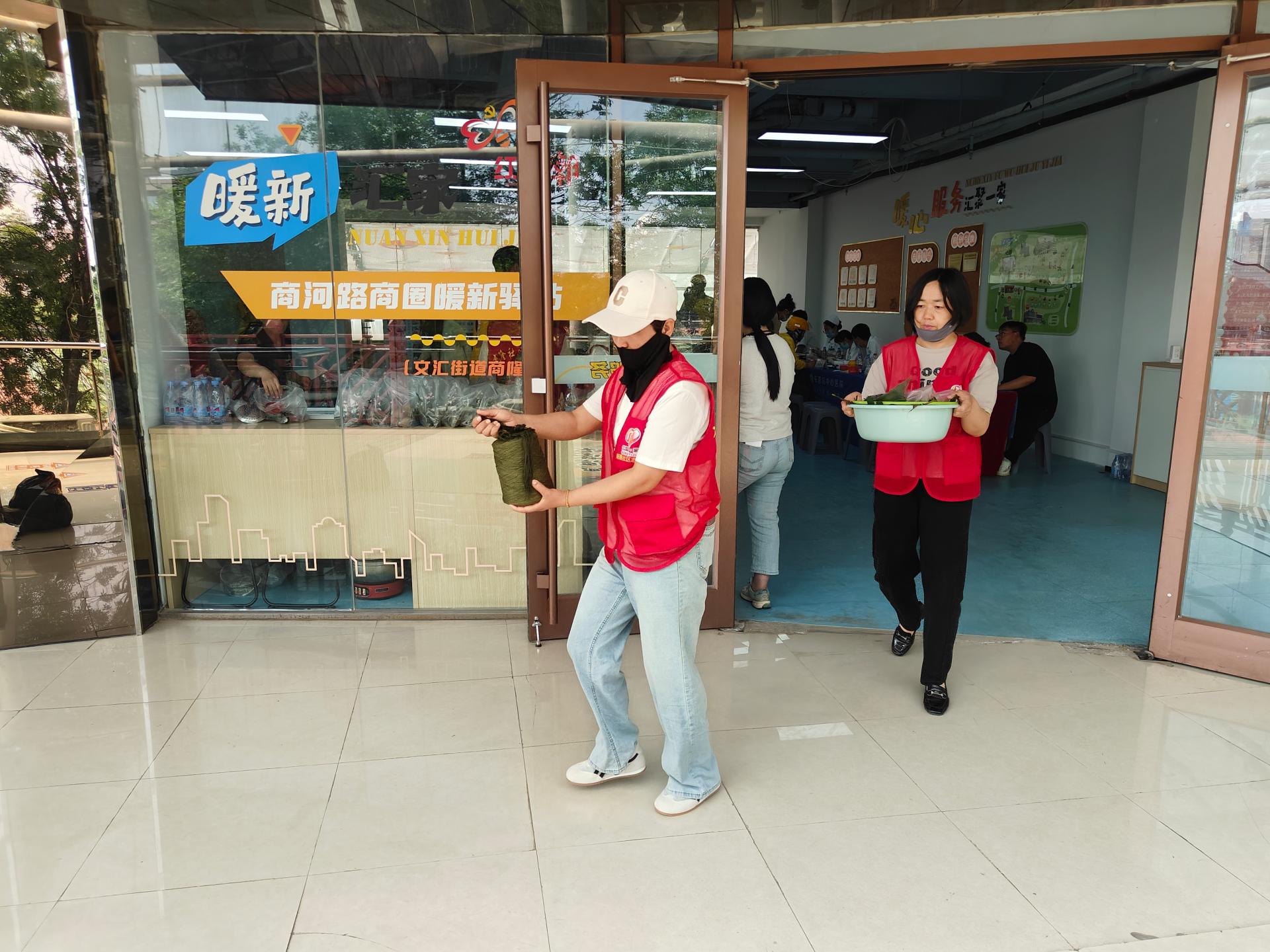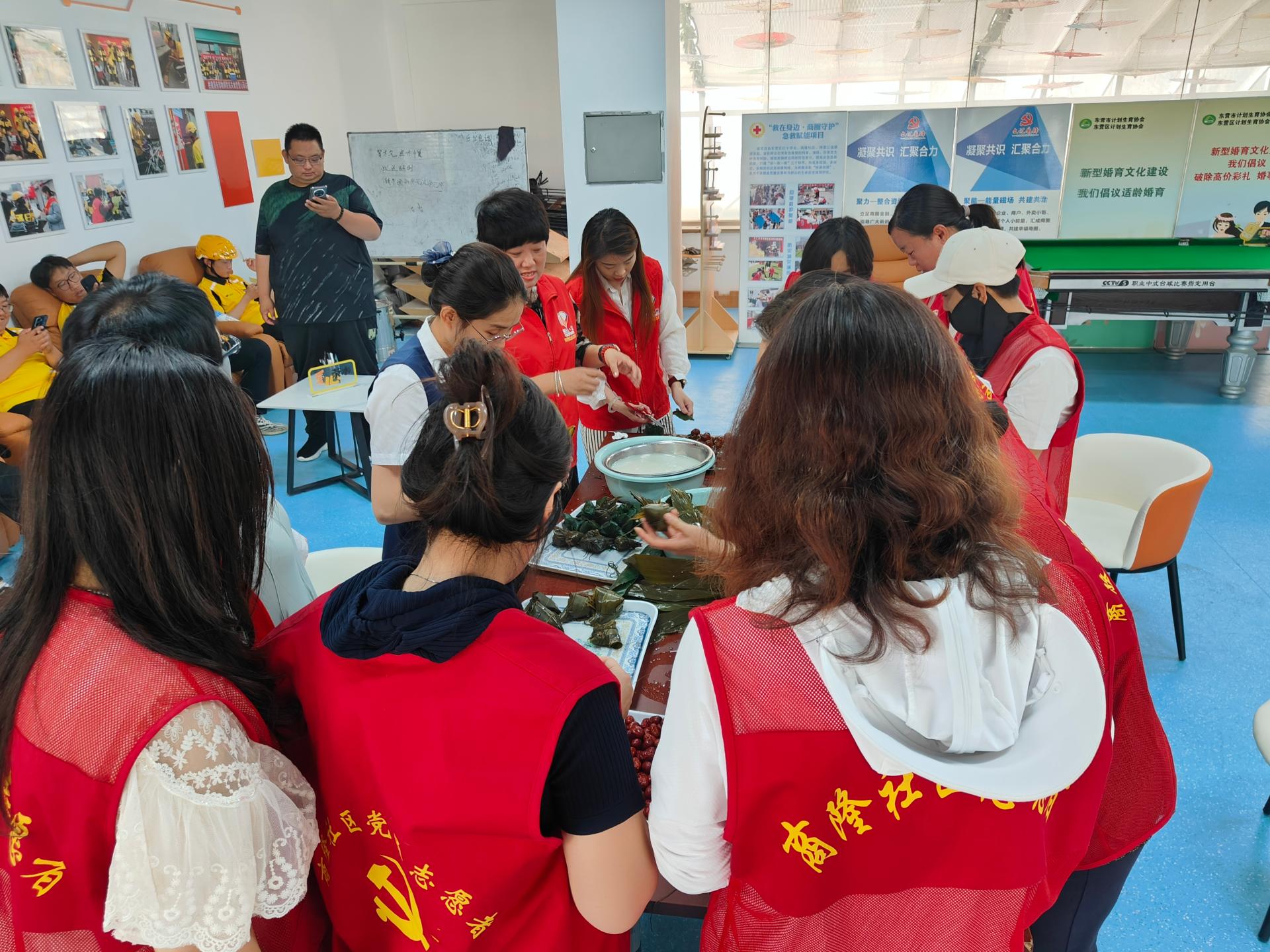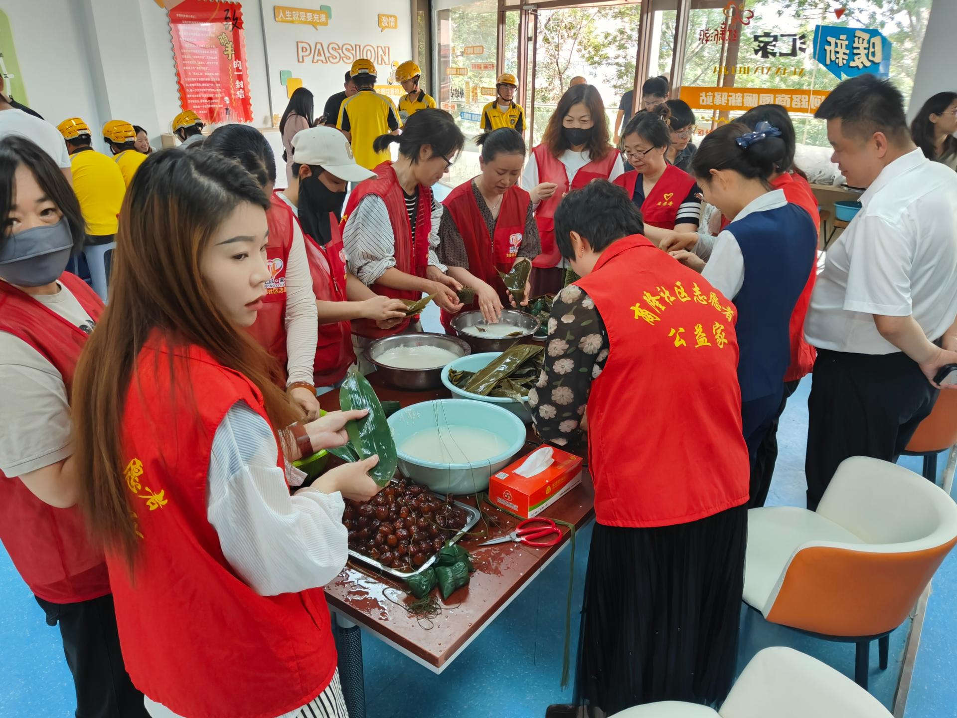 商隆社区组织志愿者,摆放桌椅,布置会场,现场包粽子,煮粽子,义诊,给新就业群体人员进行现场发放粽子,健康查体。