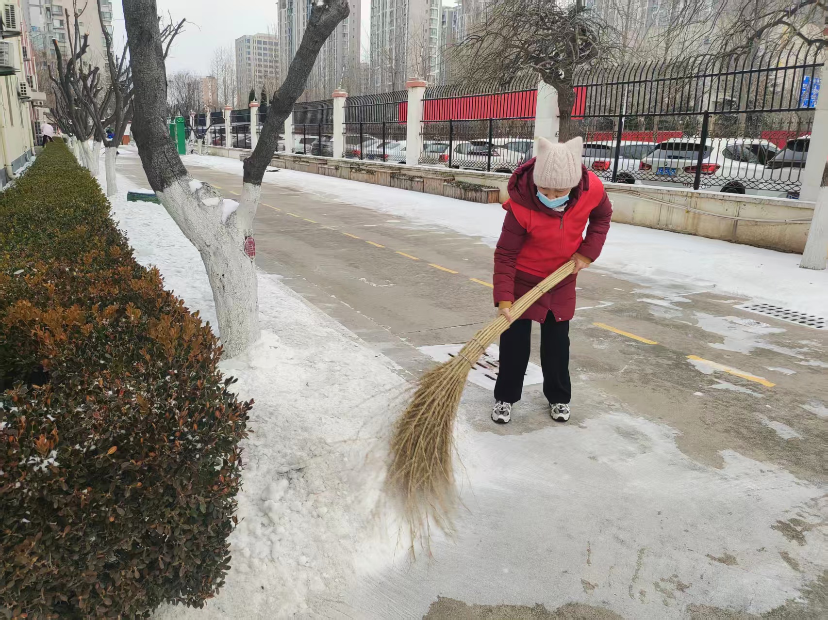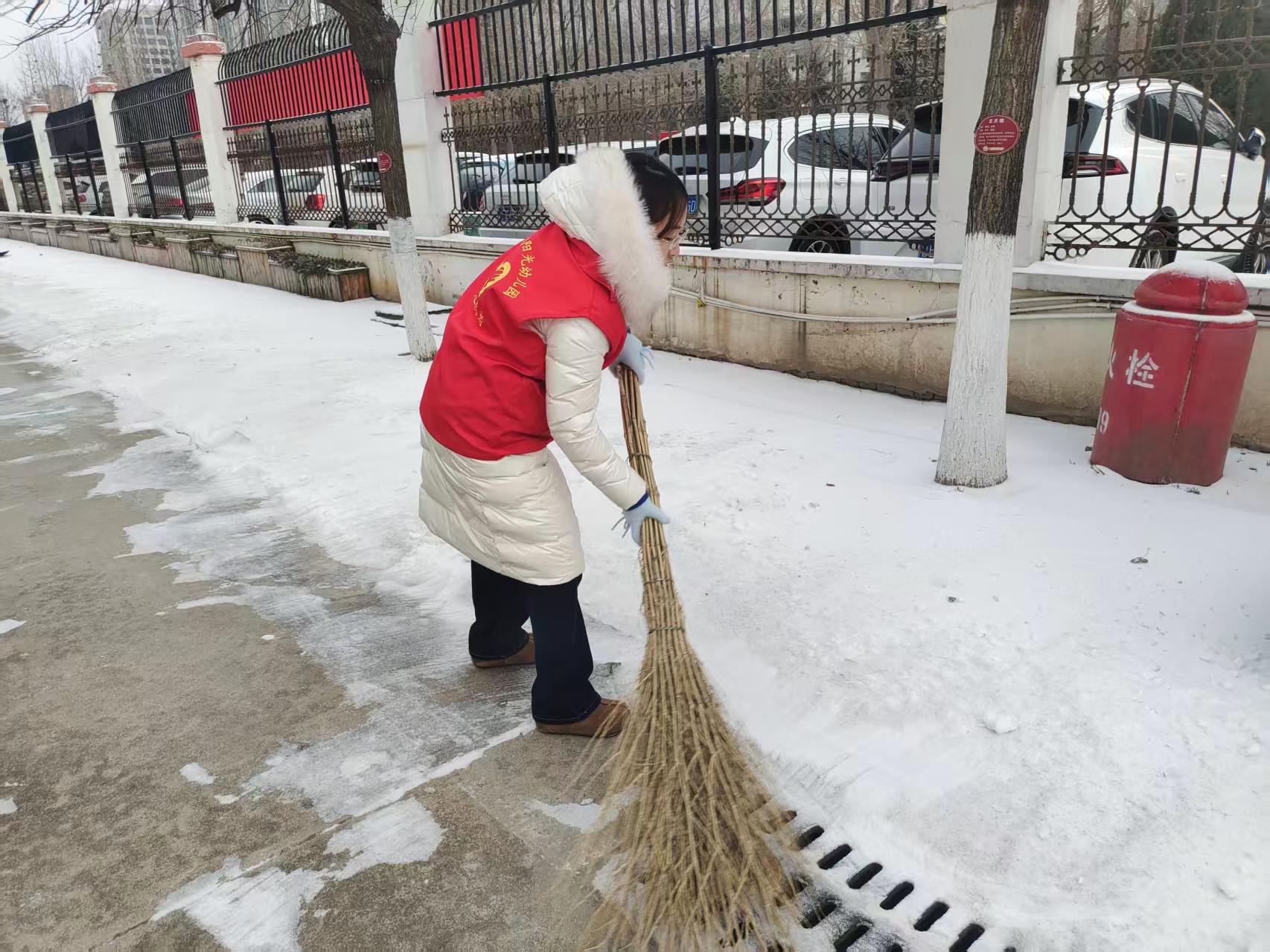 志愿者们穿好衣服,拉好拉链,拿好卫生清扫工具,在幼儿园里进行清扫卫生活动,大家不惧寒冷,干劲十足,热火朝天