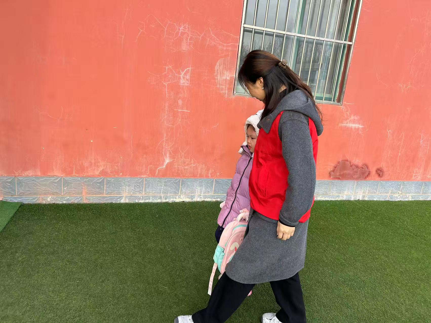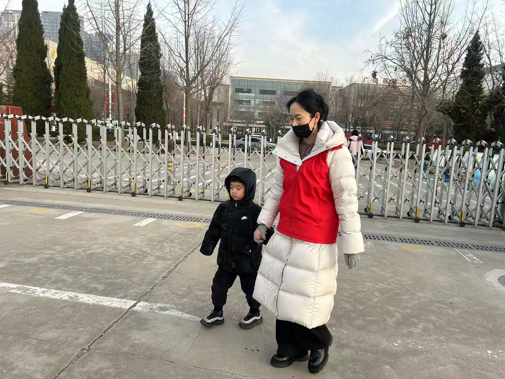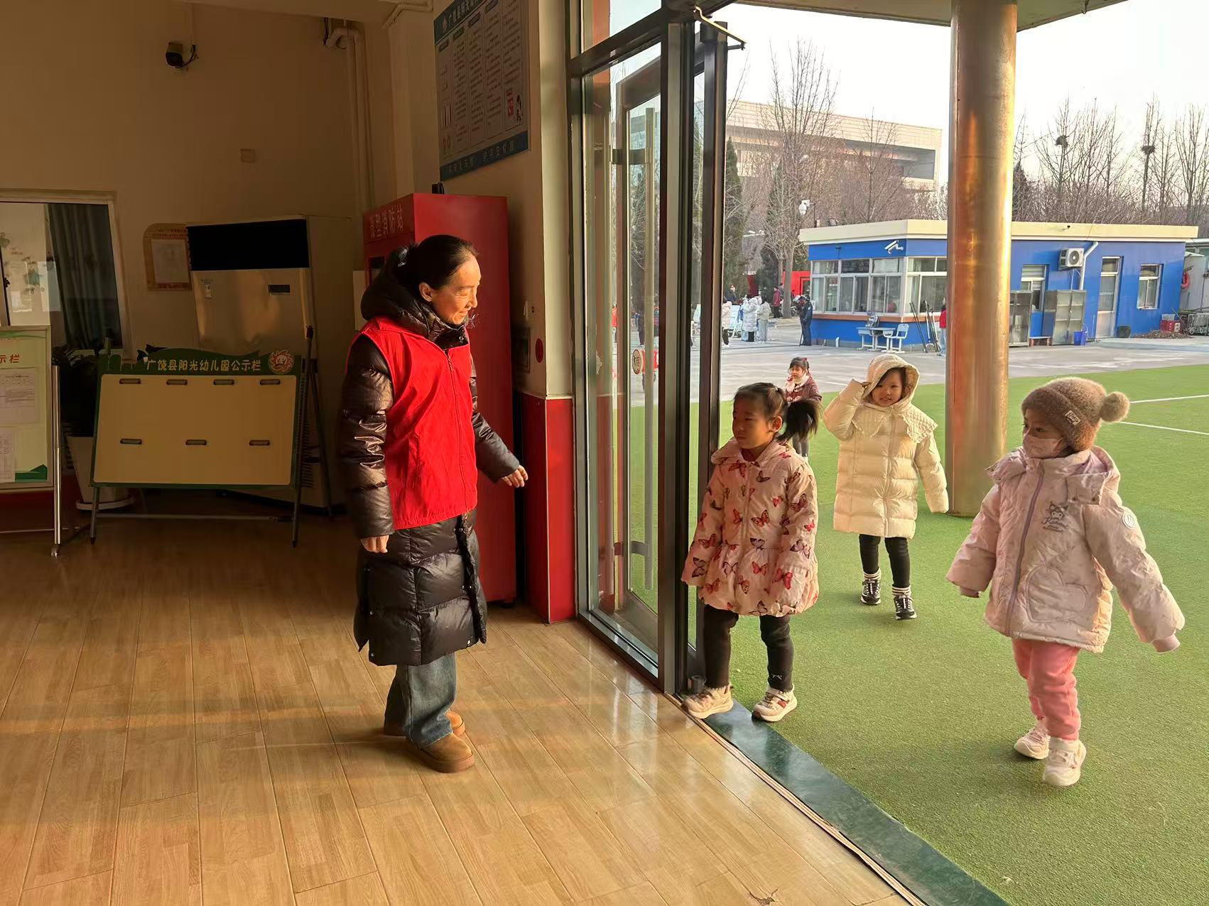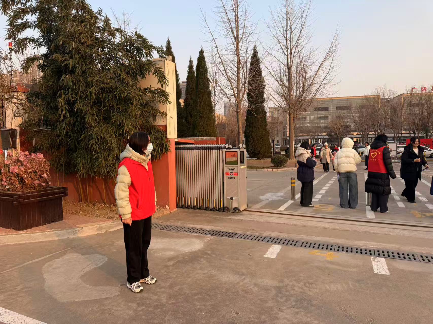 志愿者们穿好衣服,拉好拉链,拿好小旗子,在幼儿园门口进行交通导护活动,主要负责指挥家长们正确有序停放好车辆