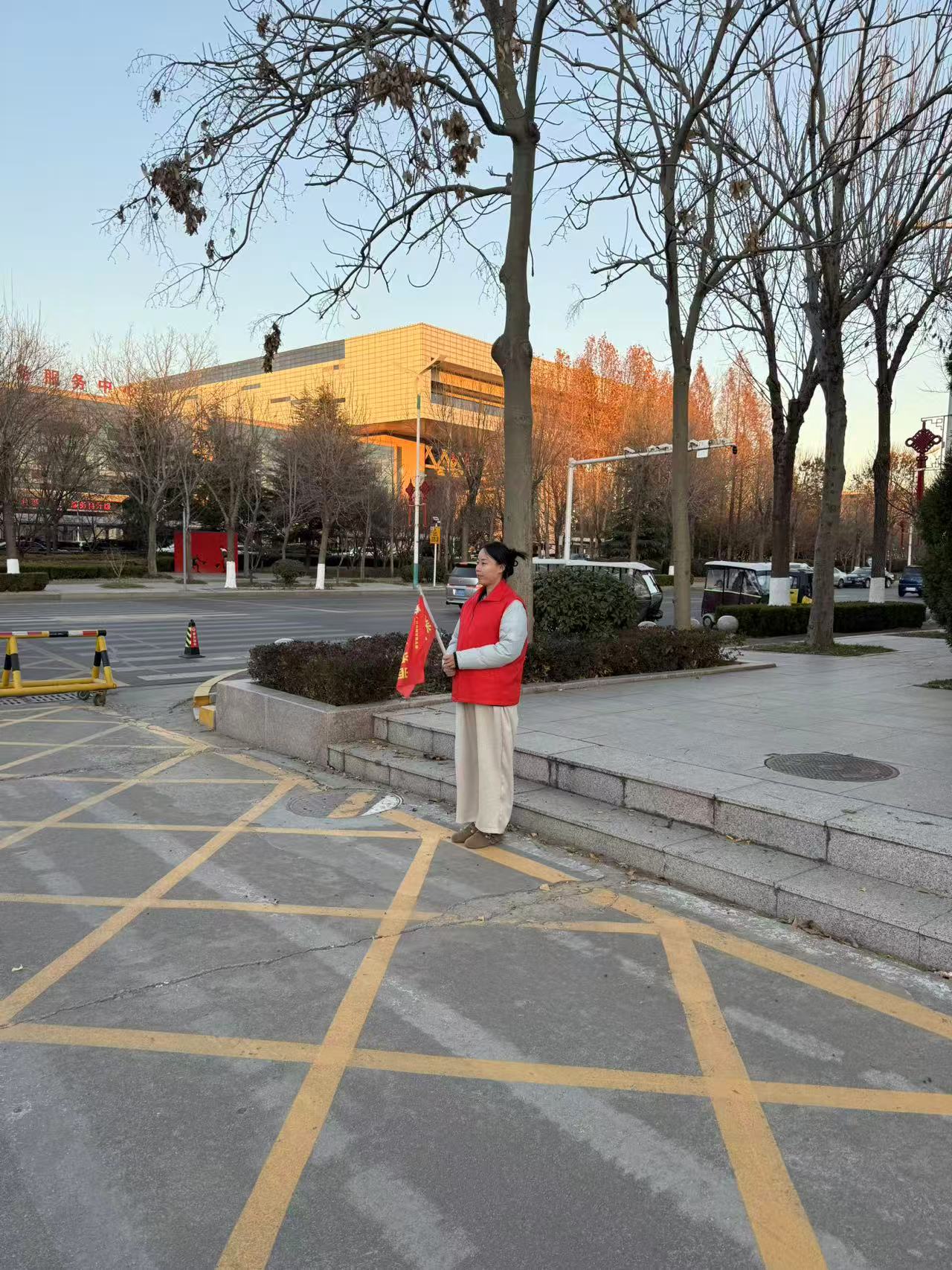 志愿者们穿好志愿服,拉好拉链,拿好小旗子,在幼儿园门口进行交通导护活动,主要负责指挥家长们正确停放好车辆