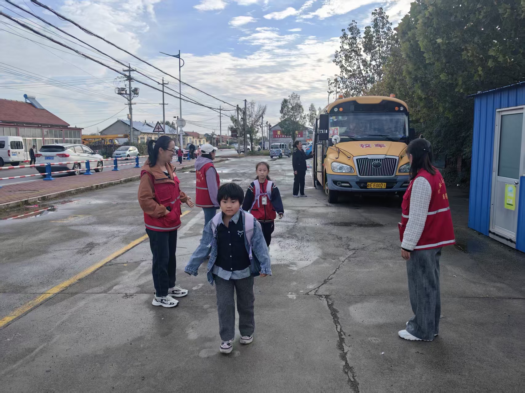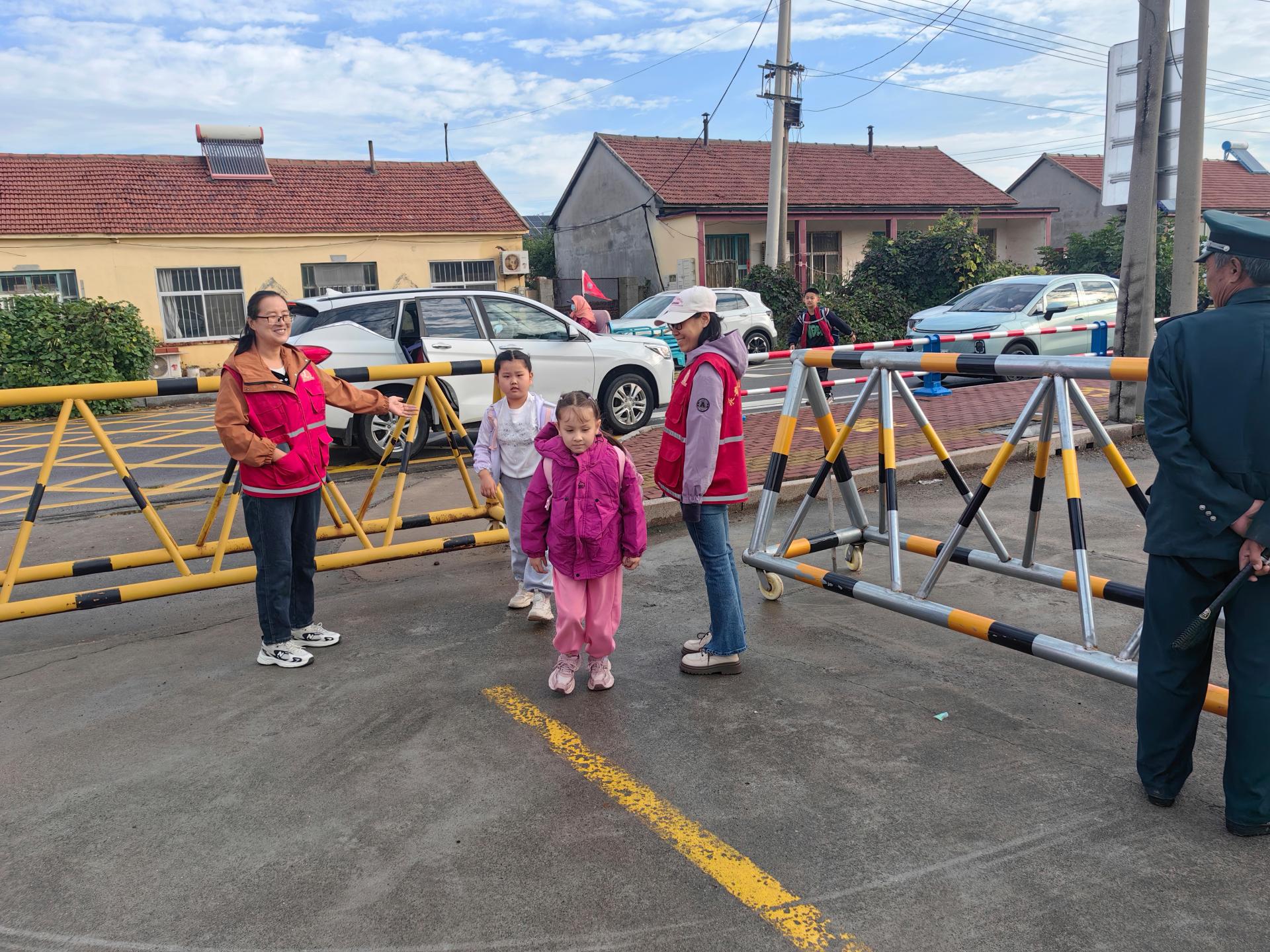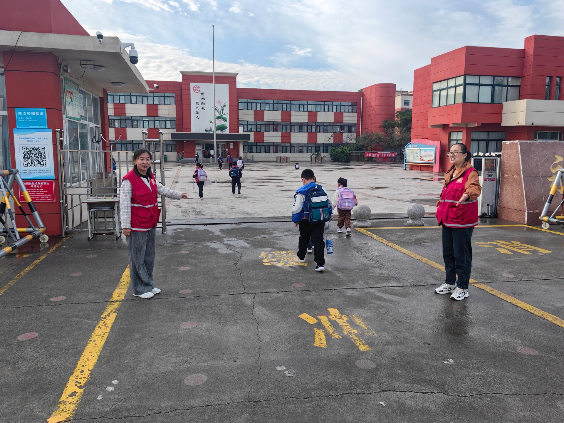 志愿者身穿志愿服,着装得体,引导学生从学校外东、西两侧有序进入学校,乘校车学生有序下车,维护学校周边环境与卫生。