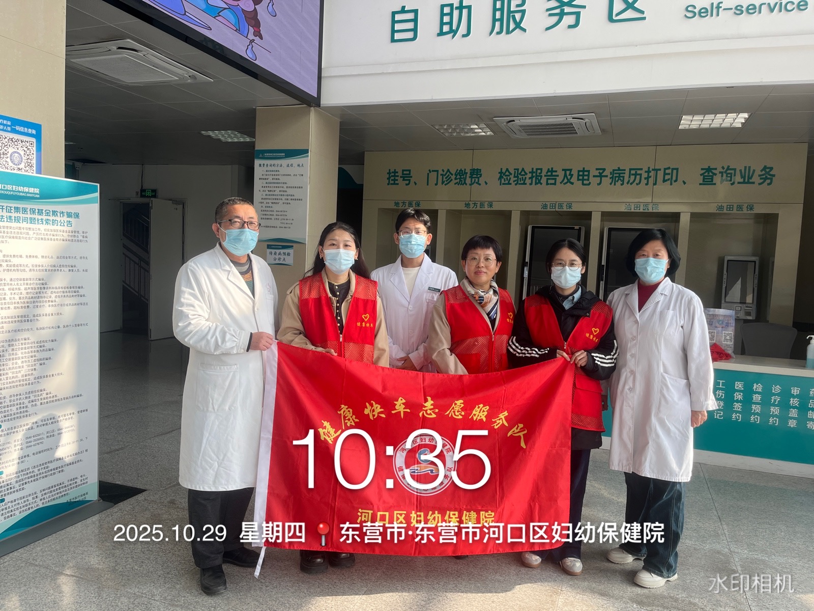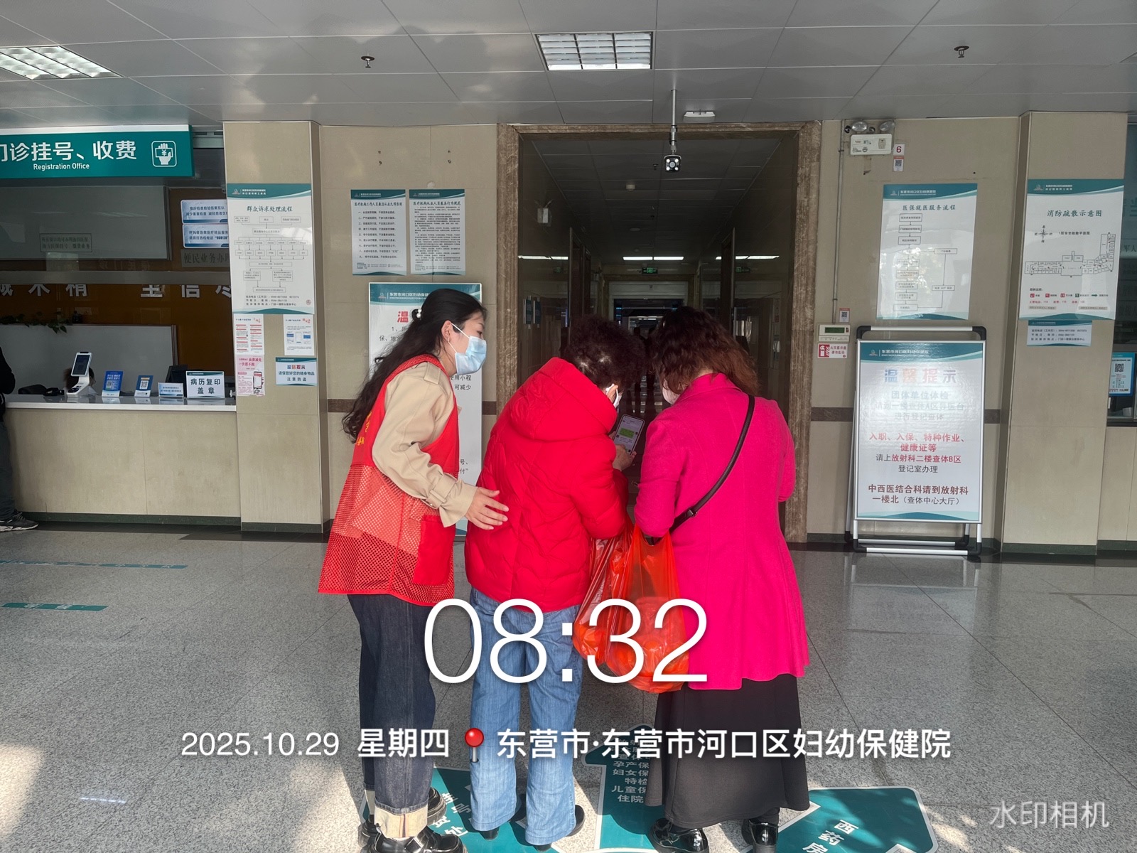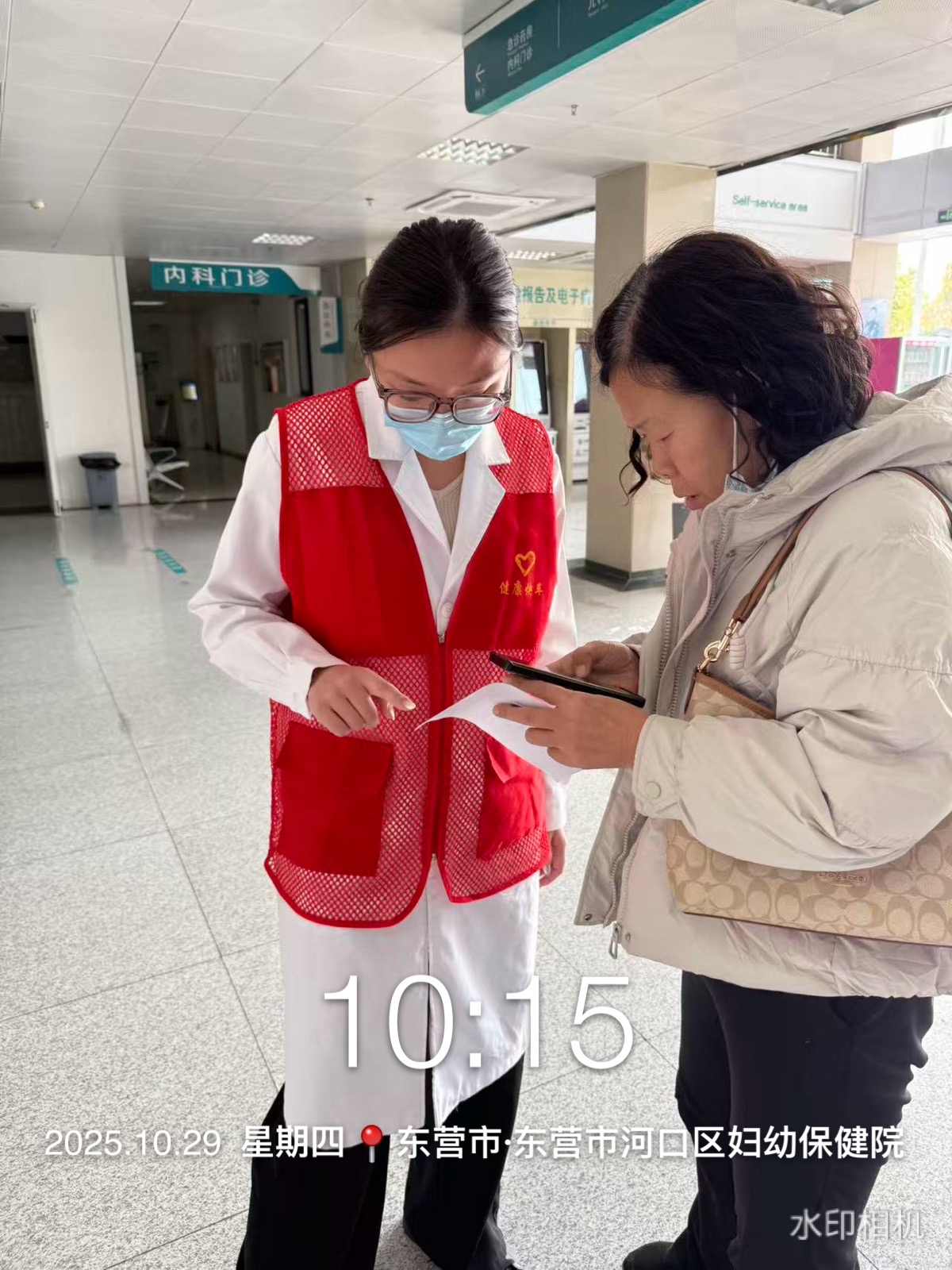 河口区妇幼保健院健康快车志愿服务队在医院院内门诊大厅、诊间、特检等多处开展咨询、导诊、挂号、购药等志愿服务活动,帮助就诊的老年人、孕妇、军人、退役军人、残疾人等就诊人员完成就诊。
