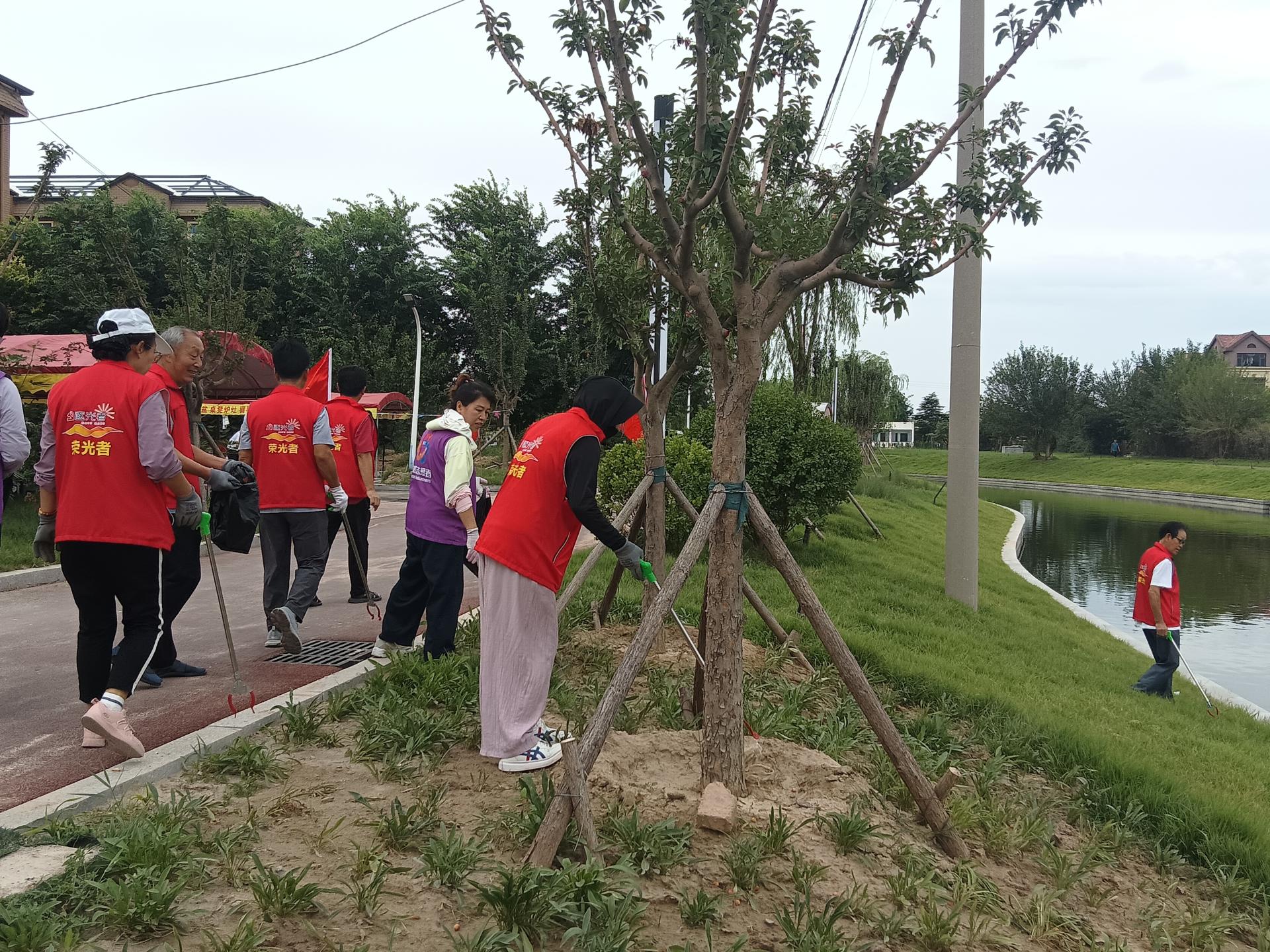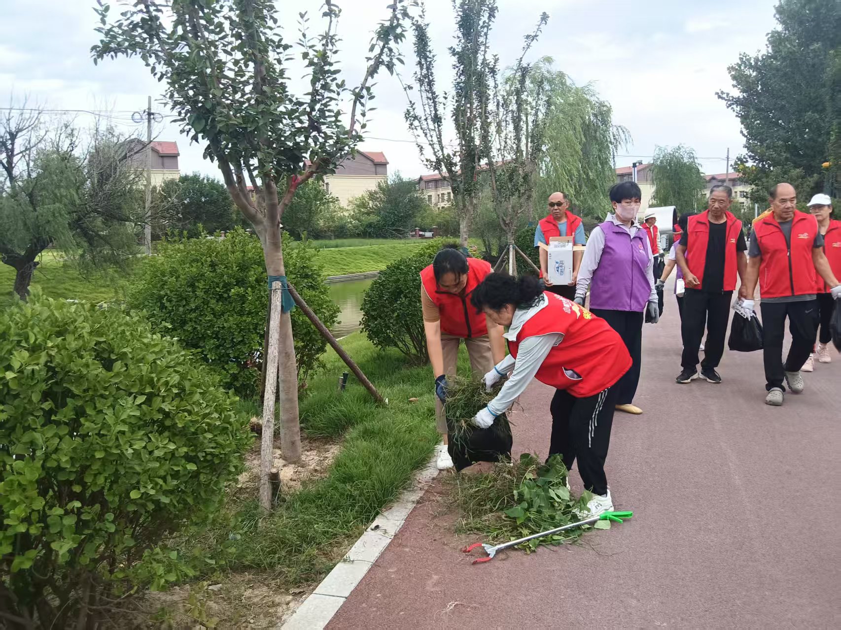 为迎国庆践行动,护河队对护城河畔周围捡白色垃圾修剪绿色树木活动,党员志愿行,喜迎国庆践行动光二党群驿站组织护城河畔捡白色垃圾和修剪树木活动