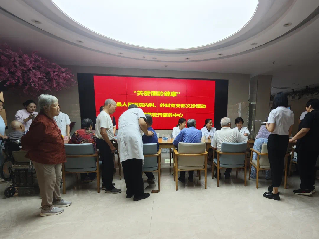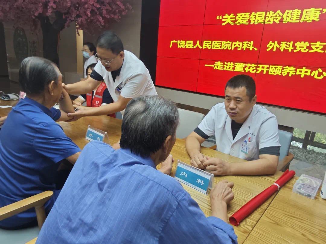 广饶县人民医院外科支部、内科支部赴萱花开颐养结合中心,为老年人提供测量血压、血糖、用药咨询等义诊服务。