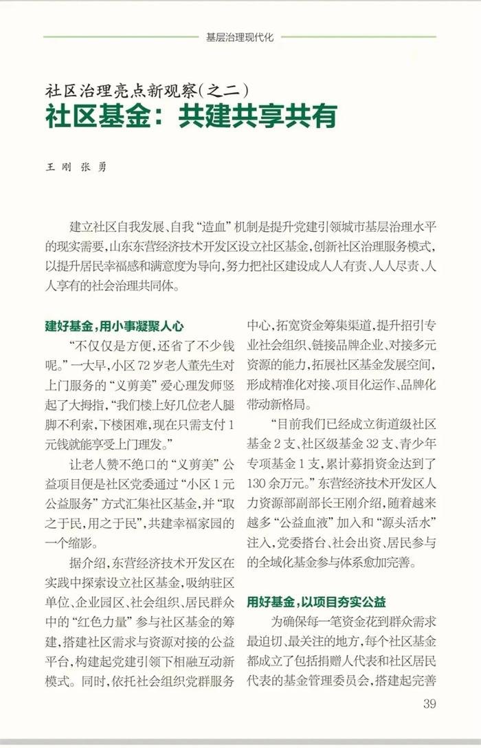 “筹建社区基金的最终目的还是要全部用于社区开展治理服务,有针对性地实施一批覆盖广、受益多的社区服务项目,让每一笔资金都能发挥出最大的社会效益、用到群众最需要的地方。”东营经济技术开发区东城街道党工委组织委员言灵说。