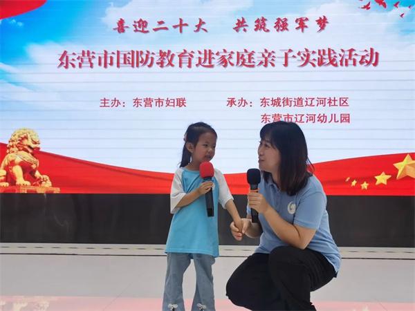 为贯彻落实习近平总书记关于加强全民国防教育的重要指示和关于注重家庭家教家风建设的重要论述精神,进一步提升全民国防意识,增强广大家庭的国防观念,在第22个全民国防教育日之际,9月16日,东营市妇联、东城街道辽河社区、辽河幼儿园共同举办“喜迎二十大 共筑强军梦”国防教育进家庭亲子实践活动。