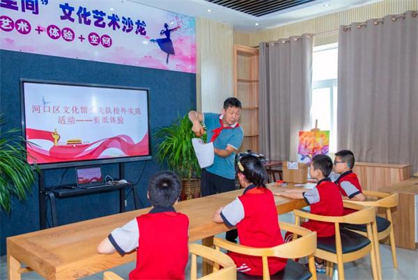 河口区文化馆的校外辅导员指导少先队员剪纸创作