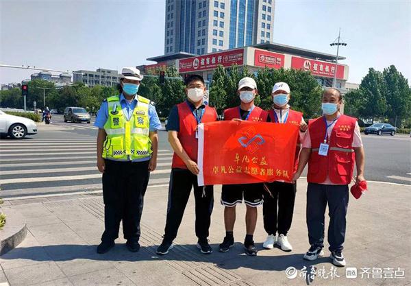 29日中午,在东三路与府前街路口,结束了一上午的文明交通劝导后,卓凡公益的志愿者张树杰和工友一起整理好马甲和工具。哪怕天气炎热,全市不少志愿者都选择了过像这样的“志愿周末”。