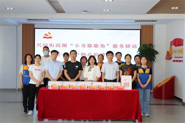 “小哥,天气太热了,进来休息休息吧。”在河口街道兴河街商圈,为快递小哥、外卖送餐员等新业态新就业群体打造了“小哥歇歇角”服务驿站,提供免费茶水、手机充电、急救药品等多项服务。辖区中邦体育店等爱心商户依托驿站积极参与‘驿’家亲“志愿服务活动,还捐赠了矿泉水、口罩、急救药箱等物资。这种快递小哥与商户之间的”双向互动“是文明商圈建设的积极实践,也是持续推进新时代文明实践商圈建设的重要一步。